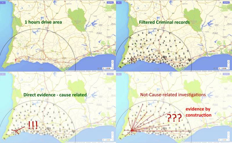 Such kinds of Not-Cause-related by evidence investigations are more or less forbidden in most democratic countries. The reason is that by this way of investigations a lot of innocent people are pestered and the risk of false accusations are extremely high. Also every investigator and prosecutor knows from experience, that mentally weak or ill persons may be forced to even false confessions under such severe stress. A well known sample related to our investigation is e.g. given in the case of the Jill Dando (→see wikipedia) murder. Not-Case-related by evidence investigations therefore are only lawful (laws differ very much by country) if in cases of a very severe crime there is indeed not any direct evidence to be found and thus the individual rights in a democracy may be overruled in a special case by decision of an appropriate judge.