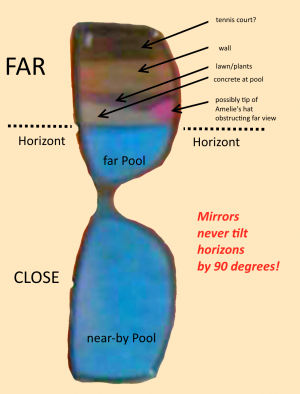 For the last possibility (3) there are also some hints in the “Last photo”: This is seemingly no shadows where Gerry is sitting (left) and a black line which can only be seen between Amelie and Maddie (right) which is suspicious. In the extreme we could understand that all of the group were put into the picture, which but sounds somehow implausible (why should have he photograph an empty scene?). More plausible but would be the supposition that not Maddie, but Gerry and Amelie were faked in. But indeed the shadows ratio for horizontal planes was 0.4 and thus may disappear at Gerry's trousers. And the black object behind Amelie may be just e.g. a drainage of the pool.