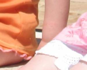 In this details-picture we have selected some black vs. white edges, which is Gerry's shoulder, Maddie's hat and the sunbed in sunlight. As we may see we have at all margins some artefacts. But at the sunbed, which is definitely not a fake, there are seemingly no large artefacts. At Gerry shoulder there are also slightly visible artefacts (so called ringing, which is a kind of double ghost-line), but at Maddie's hat they are the strongest.