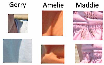 We have to remark here, that the shadows at Maddie are less precise, lighter and more blurry. While on Gerry and Amelie there are a lot of precise lokations of shadows, at Maddie there are only hair's shadows which can be identified precisely. Possibly the different sharpness of shadows may be attributed to different lighting conditions, the later to be at time with a more diffuse sun.
