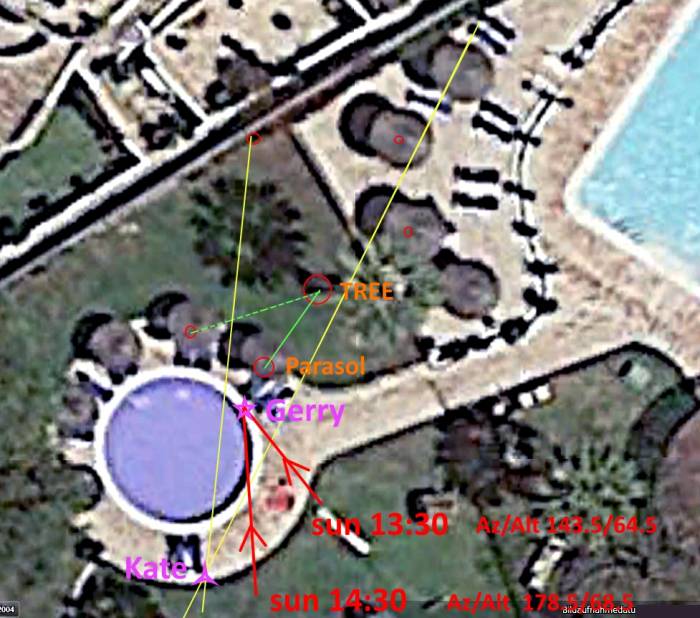 So what we have to do first is evaluating the sun in Praia da Luz on the 3rd May 2007 at 13:30 and at 14:30. This are the time (1) from EXIF-data (13:30) and the time claimed by McCann (14:30) because the cam clock allegedly wasn't correctly adjusted from winter back to summer time. Using astronomical software like →Stellarium we can find the values for (1) Az./Alt. was 143.5 (nearly southeast) / 64.5 ( -25.5 from zenit) degrees and for (2) Az./Alt. was 178.5 (nearly south)/ 68.5 (-21.5 from zenit) degrees. From Exif-Data we also know →hyperfocal plain was 18.8 meters, which gives a distance to Gerry of about the half which is 9.4 meters. Also we know the opening angle of the lens, which was 19.6 degrees. From this data and by analysing the contents of the picture we get using →GoogleEarth the following geometrical situation of the scene: