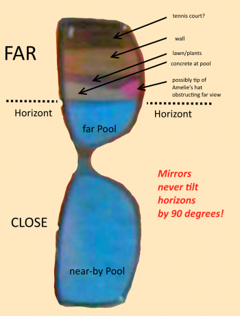 The reflection thus is for sure related to sunglasses originally hanging down at 90 degree e.g. at Gerry's T-shirt collar on this or another photo. We can also identify details of the reflection, which are seemingly the pool and the plants and concrete walls on the other poolside, located at the small pathway in front of the Ocean Club flats, or other way round, in direction of the Tennis Courts at the Ocean Club, depending on the position of photographer Kate. The other fakes in the picture are not that easy to prove, but we have to conclude that “the last photo” is in truth composed from different unrelated photos into one.