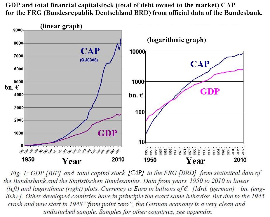 For this we have a look at Figure 2, in which we have entered next to the total capital stock the share of direct capital investment by lending to non-banks according to official data from years 1950 to 2010. The graph clearly shows that it is increasingly difficult for the GDP to process the existing amount of capital. About in 1967 the total capital stock already exceeded the entire9 GDP, from the mid-1980s even the direct use of capital stock by loans exceeded 100% of the GDP.